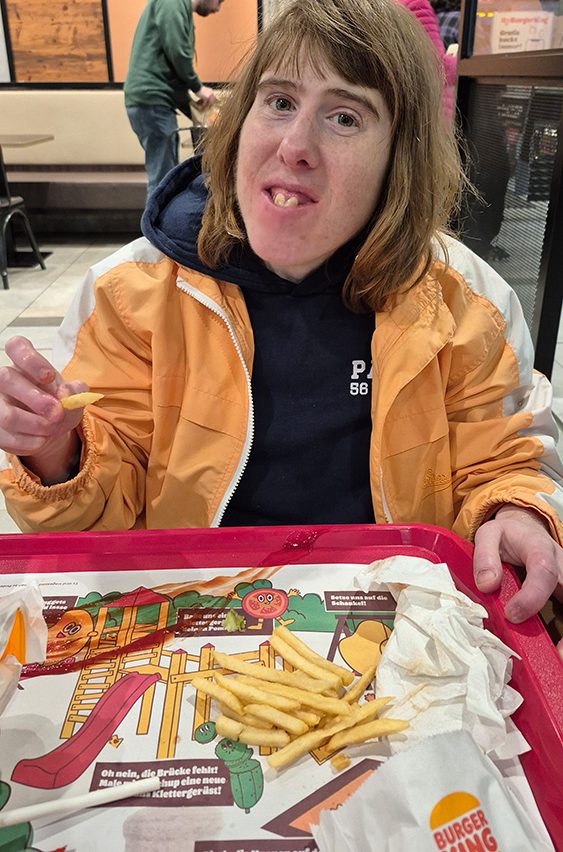 Nach dem Museumsbesuch stärkte sich Julia mit Kuchen und einem Getränk, bevor die beiden wieder die Rückfahrt zur Lebensbrücke antraten. Unterwegs legten sie noch einen Stopp bei Burger King ein. Julia suchte sich ihr Menü selbst aus und ließ sich Burger und Pommes ordentlich schmecken. Kaum wieder zuhause angekommen, berichtete Julia den anwesenden Mitarbeitenden fröhlich von ihrem erlebnisreichen Tag – natürlich inklusive ihres neuen Plüschtiers und dem leckeren Abendessen.