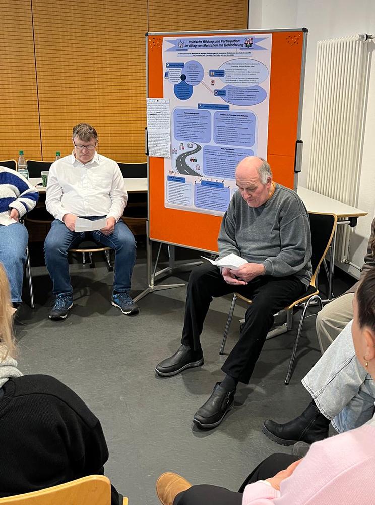 Für das maximale Maß an Praxisnähe nahmen zwei unserer Klienten in Begleitung eines Mitarbeitenden am Seminar teil und gaben als Experten wertvolle Einblicke. Aus erster Hand berichteten sie über die Politik für und Diskriminierung von Menschen mit Beeinträchtigungen. Heinz las einen eigens für diesen Zweck verfassten Brief vor, während Uwe mündlich von seinen Erfahrungen berichtete.