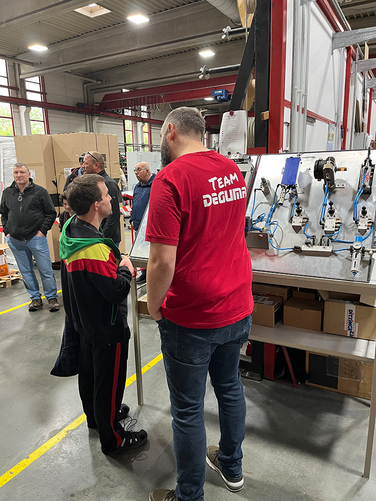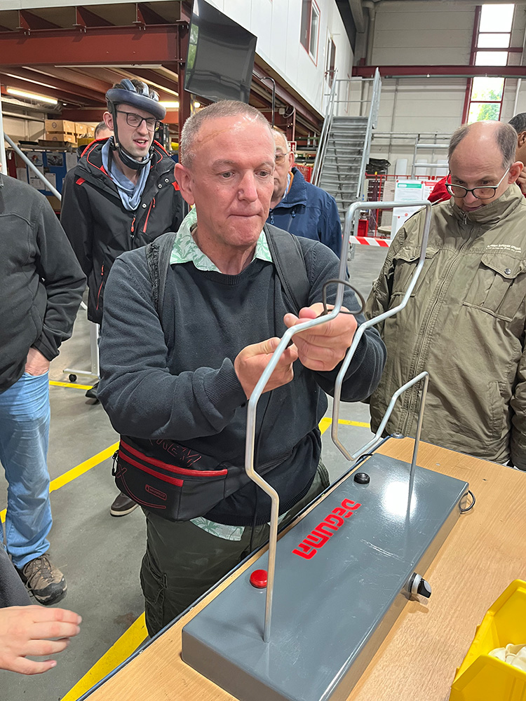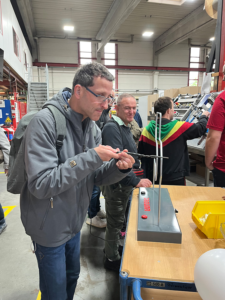 Weiter ging es zur Deguma-Schütz GmbH, die eine kleine Experimentierwerkstatt vorbereitet hatte. Dort konnten unsere Klient*innen Pneumatik, Elektrizität und mechanische Vorgänge hautnah erleben. Besonders spannend: Eine Geschicklichkeitsübung, bei der man einen Stab möglichst berührungslos führen musste. Dabei war höchste Konzentration gefragt!