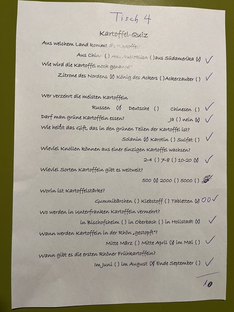 Das Kartoffel-Thema zog sich durch, denn nach dem guten Abendessen wartete noch der wahre Höhepunkt: Das Kartoffelquiz. Mit der „Quizkönigin“ Rita rätselte unser Team mit voller Begeisterung und hoffte auf viele richtige Antworten. Und tatsächlich:
