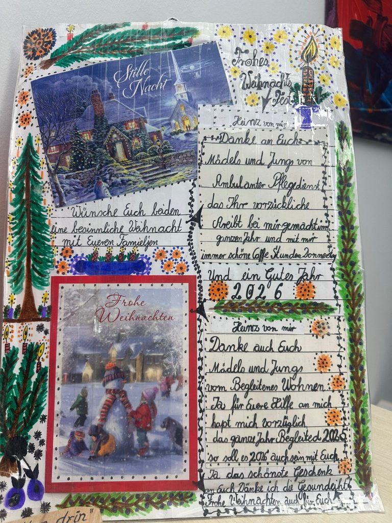 Ein ganz besonderes Highlight kam von unserem Klienten Heinz, der sich viel Mühe gegeben und ein wunderschönes weihnachtliches Bild gestaltet hat. Ein Geschenk, das von Herzen kommt und genau dort auch ankommt.