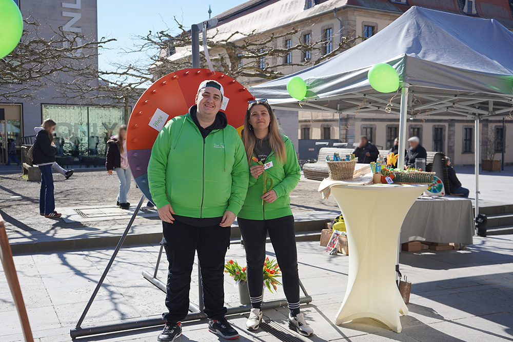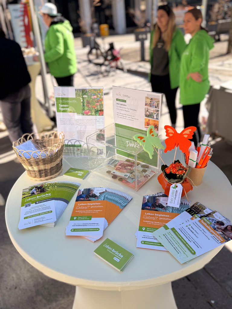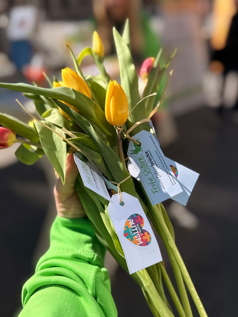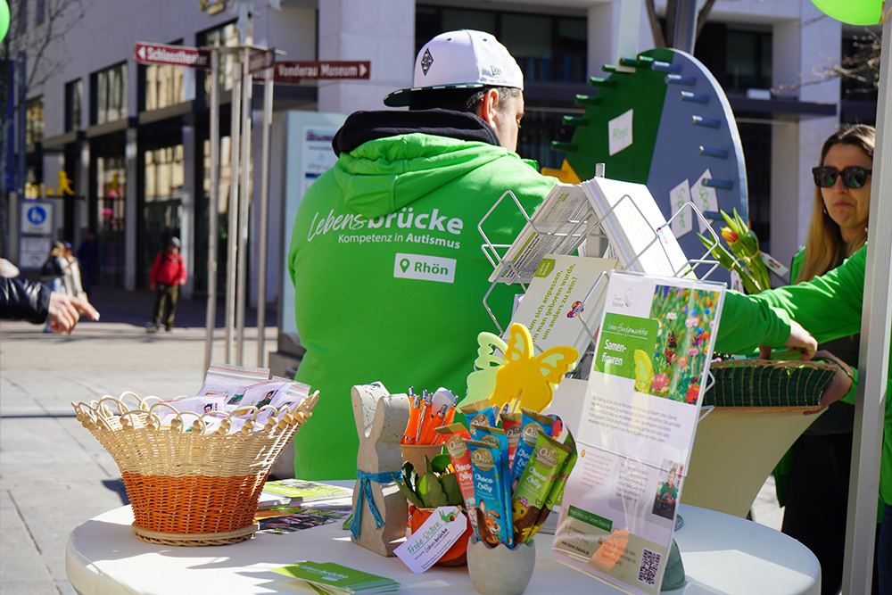 Das Angebot lud dazu ein, sich aktiv mit dem Thema auseinanderzusetzen: Neben Infomaterial rund um Autismus und die „Lebensbrücke“ sorgten anschauliche Beispiele zur Unterstützten Kommunikation (UK) sowie ein Glücksrad mit kleinen Preisen für Aufmerksamkeit unter den kleinen Besucher*innen. Besonderen Anklang fanden die Tulpen mit kleinen Ostergrüßen, die als nette Geste an Vorübergehende verschenkt wurden. Auch die Möglichkeit zu spenden wurde gerne