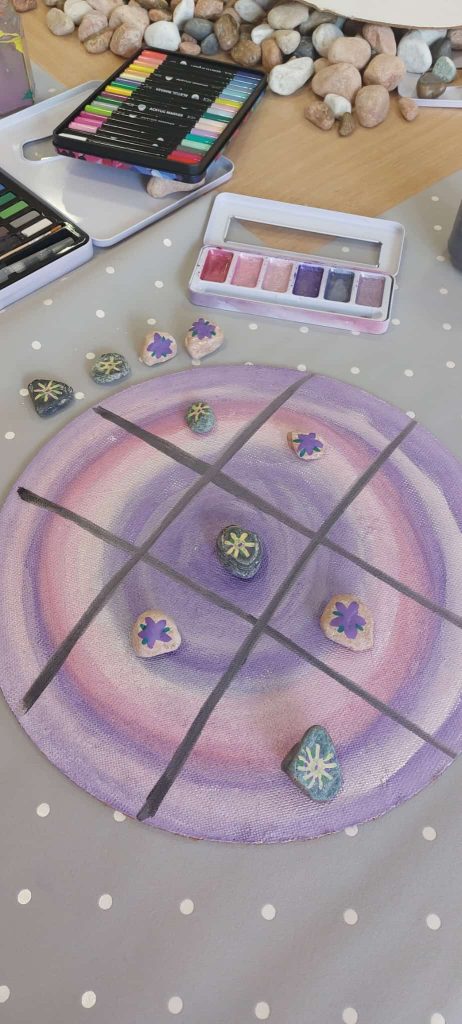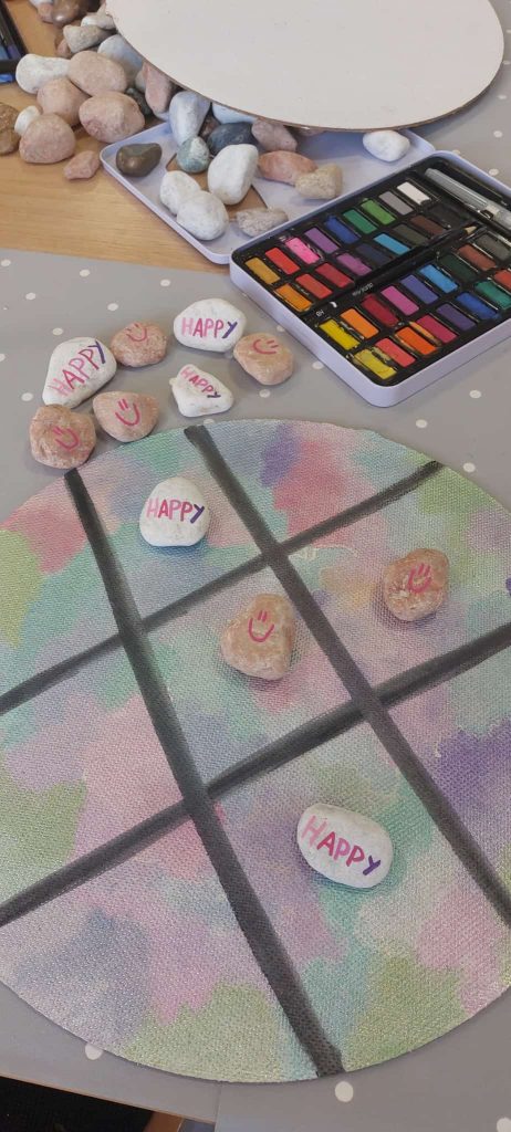 Als Grundlage dienten Holzscheiben, die im Vorfeld von Klient Erhard eifrig und mit Freude weiß grundiert wurden. Für die Teilnehmenden konnte es also direkt ans farbenfrohe Gestalten gehen. Als Spielfiguren wurden Steine nach Lust und Laune bemalt. Jedes Stück wurde dadurch zum echten Unikat!