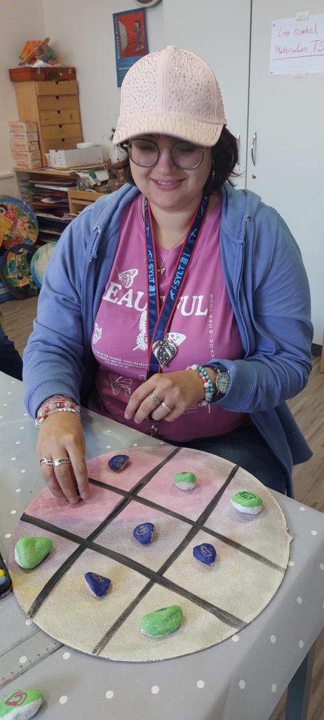 Als besonderes Highlight hatte sich unsere Mitarbeiterin Sandra wieder eine tolle Kunstaktion ausgedacht und mit Kollegin Josephine angeboten. Gemeinsam mit unseren Klient*innen konnten kleine und große Marktbesucher*innen ein eigenes Tic-Tac-Toe-Spiel basteln.